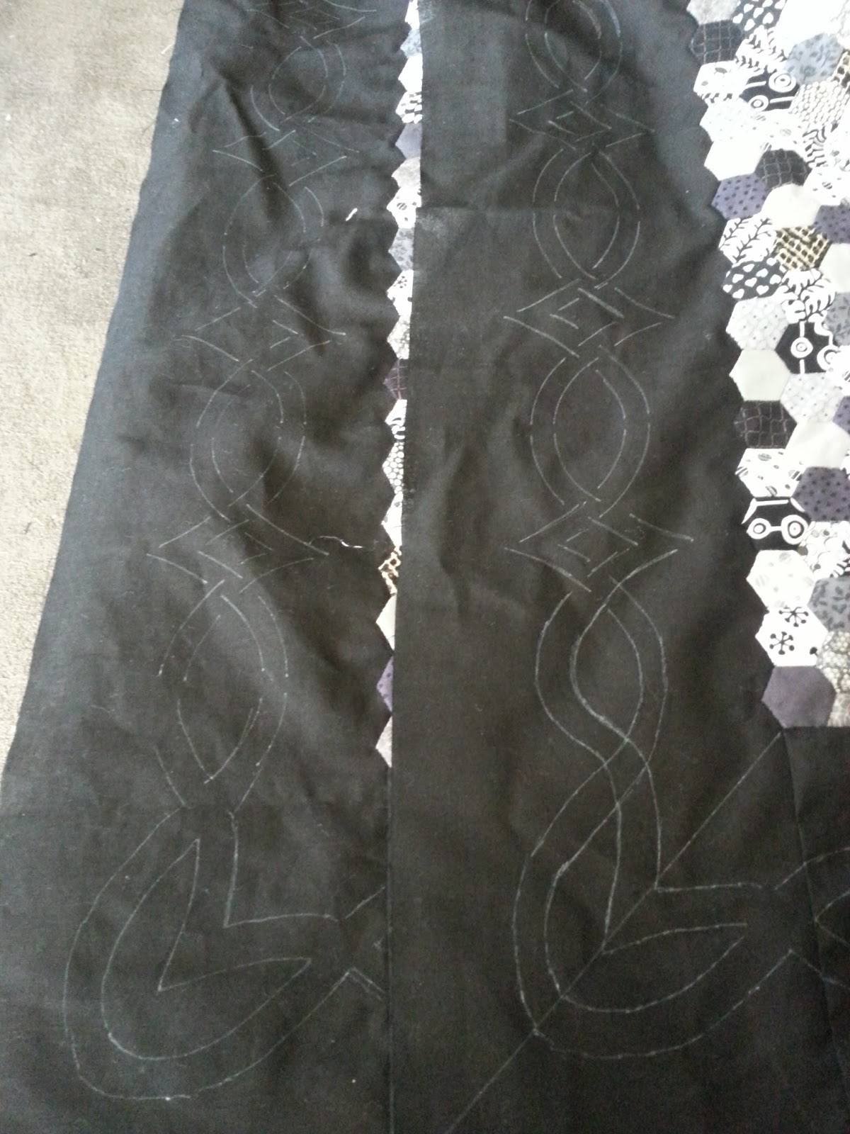 I have been making progress on my sons "Insanity quilt", as you can see I have finished sewing a verity of black and grey hexagons together for the final hexagon border. Then I have appliqued the final border in place.